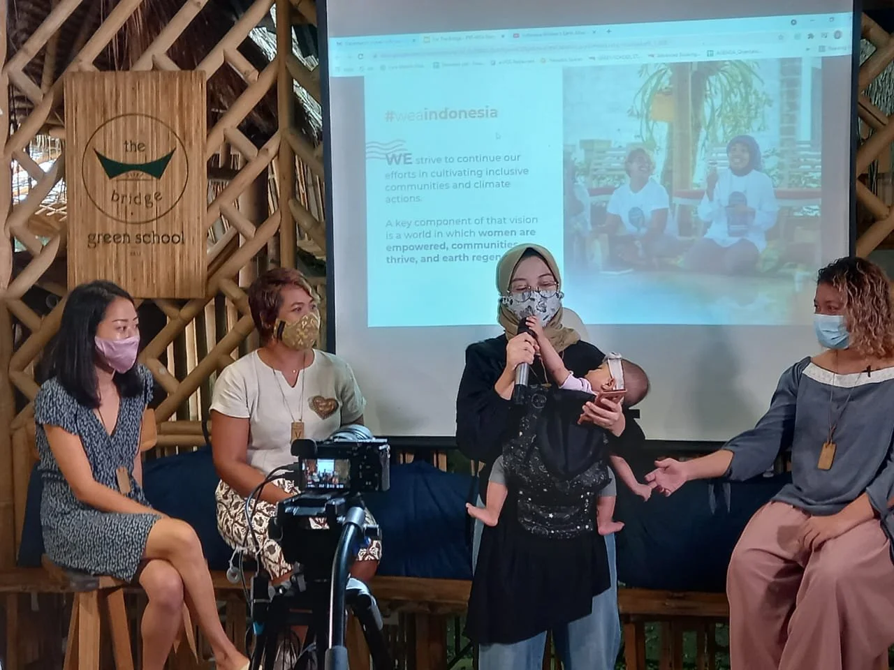 For a housewife or househusband, balancing work and baby might be impossible... in the past. Look at our Chairperson here, Saniy Amalia Priscila, who has just delivered her firstborn a year ago. In the picture below, we can see Saniy, carrying her newborn baby while giving a presentation at a workshop event. How is this possible?